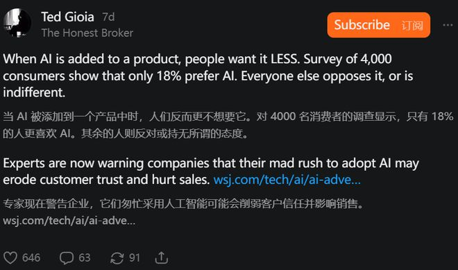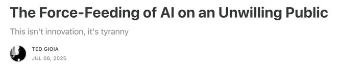 国外一位创作者小哥Ted Gioia撰长文自曝,如今科技大厂,硬把AI塞进生活边角。