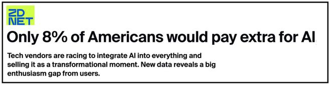 最近一项调查显示,只有8%的人愿意为AI掏钱。所以,科技大厂必须把AI和其他一些不得不用产品捆绑销售。