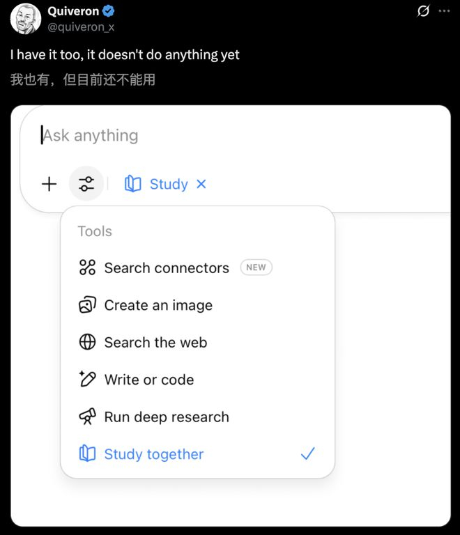另一边,OpenAI最近要在ChatGPT上线一款新功能——Study Together(一起学习)。
