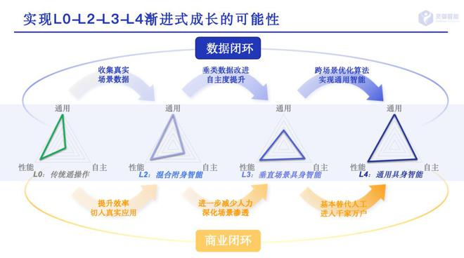 • 第一种是企业想办法直达L4,把作业成功率提升到99.9%以上,实现机器人在多场景的全自主工作状态,但这种路径耗费的时间长、成本大。目前机器人数据处于极度稀缺状态,企业需要非常多的真机数据和资源资金,才有可能训练出一个符合人类期待的高智能的 AGI 机器人。