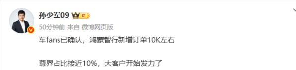【智车派新闻】据车fans创始人孙少军透露,上周(6月30日至7月6日),鸿蒙智行品牌新增订单约1万份,其中尊界品牌占比约为10%,新增订单约1000份。