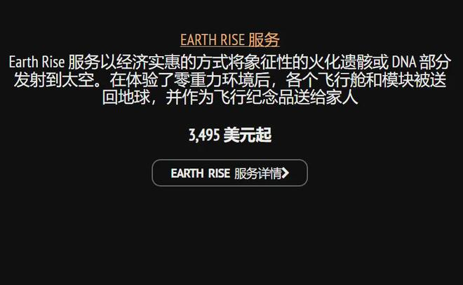 只能说,确实贵,但没你想象中那么贵。最便宜的绕地飞行纪念之旅,售价是3495美元/克起,折合人民币2.5万,你就能拿下一个坑位,最贵的月球/深空安葬服务,12995美元/克,约人民币9.3万元。总体上属于普通人努努力能圆梦的级别,对于中产家庭来说,给自己逝去的亲人风光一把,不至于太肉疼。