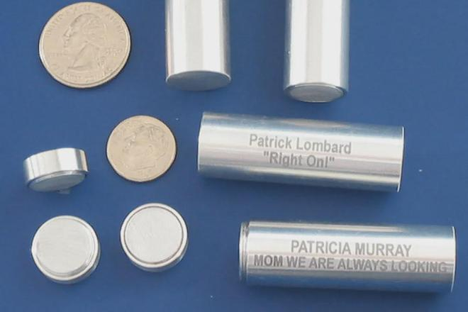 具体来说,他们收到订单之后,会用特殊金属容器装载骨灰,纽扣大小的容器大约装1克,也有电池大小的容器可选,能装载7克。