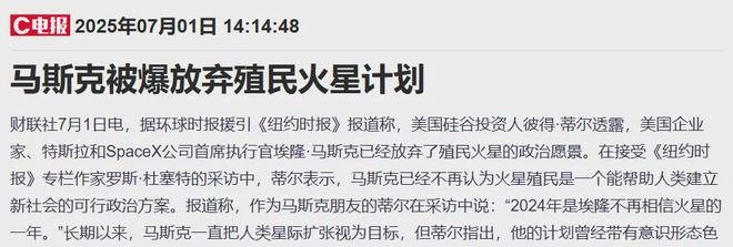 可能是这个不上不下的利润数字,让马斯克看清了商业航天的困境,最近有消息称,他已经事实上放弃了极为激进的火星殖民计划,当年放出的“20年内建立火星城市”豪言壮语,败给了现实。