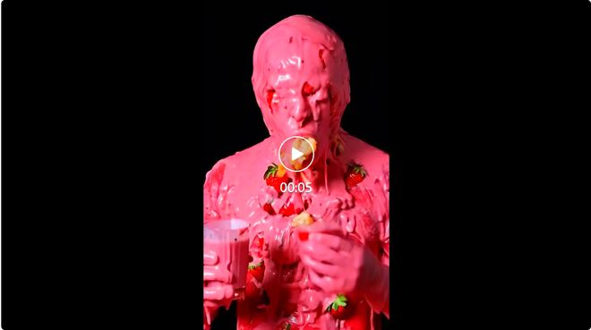 以上视频出自博主 Bennett Waisbren 之手,他的灵感来源是吃播视频,以暗黑风格凸显了现代人对暴食的渴望。虽然想表达的内涵很深刻,但视觉上给人强烈的不适。