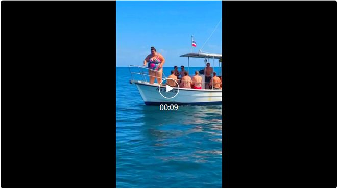 视频中,一个身穿比基尼的胖女人笨拙地踩上船边栏杆,猛地朝海里一跃,瞬间溅起巨大的水花,同时船身也因为她的重量和动作失去了平衡,一整个栽进了海里。