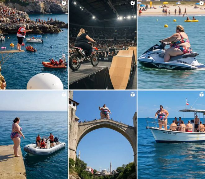 如果再往下扒拉扒拉该博主的其他作品,大部分人都会产生一种强烈的、浑身起鸡皮疙瘩的不适感,人身猪面的跳水者、丧尸形象的受访者,以及奇形怪状的不明生物…… 一个比一个瘆人。(AI 惊悚含量太高,避免引起不适就不放视频了)