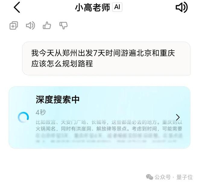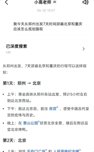 这就是最新版高德最大的亮点:小高老师,出行专业智能体,也是调用各种出行服务的主Agent。呼唤小高老师最直接的方式是,在主页面点击对话按键,然后说出你的需求,比如给正在上初中的孩子安排一个北京三天游。