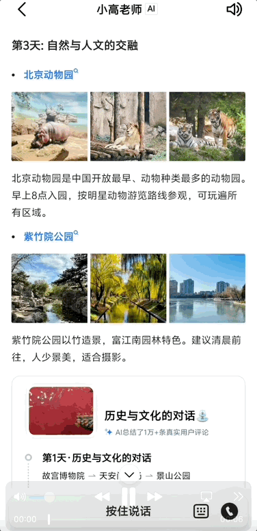 比如小高老师推荐咱去北京动物园,直接点击输出的对应结果,一键就能开始导航,行程前到行程中无缝衔接,非常丝滑。