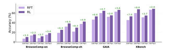 为了让WebSailor更好地掌握复杂网页信息处理能力,通义团队设计了一套创新性的训练方法,包括三个关键模块:一是“地狱级试炼场”SailorFog-QA,通过真实网页构建图谱,制造信息混淆,让模型跨越多个页面整合线索,挑战人类认知极限;二是“重构推理逻辑”,摒弃冗长重复的推理链,让模型学习简洁、直击重点的思考方式,提升思维灵活性;三是“强化学习DUPO算法”,通过动态筛选高质量训练样本,提高训练效率2~3倍。