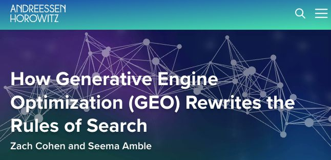 a16z 上个月发表了一篇文章,试图描绘一个新的图景:从 SEO(搜索引擎优化)转移到 GEO(生成引擎优化)。