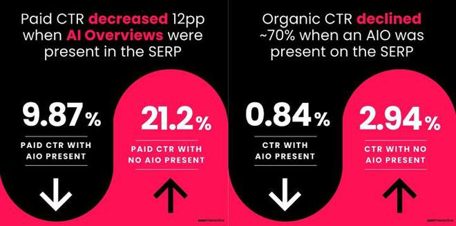 市场营销公司 Seer Interactive 做了一些关于 AI 汇总功能对网站点击率冲击的研究,发现 AI Overviews 对搜索结果页点击率的降低效果达到 70%,对网站主投放的付费广告的点击率则直接砍半。