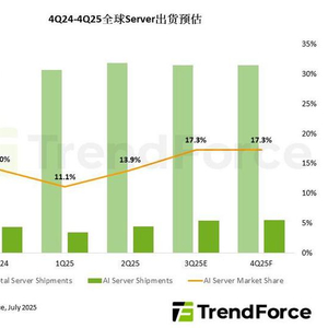 IT之家 7 月 7 日消息,TrendForce 集邦咨询在本月 2 日发布的资讯中将对 2025 年全球 AI 服务器出货量同比变化的预测调整至 +24.3%,相较 4 月 8 日的 +24.5% 小幅下修 0.2 个百分点。
