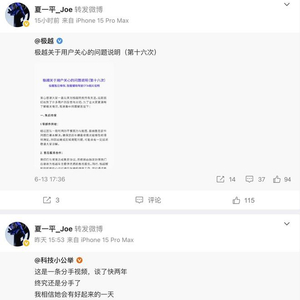 日前,极越汽车CEO夏一平突然转发了两条微博,一条是极越汽车官方微博发布的《极越关于用户关心的问题说明(第十六次)》(以下简称:《说明》);另一条是自媒体博主@科技小公举 与极越01的“分手”视频,该博主出售了自己购买的极越01,并在视频中对这款车的智能座舱大加赞赏,认为极越汽车的智能座舱在新能源车企中可排进前三。在视频的最后,该博主提到极越正在进行重组,有新的资金注入。