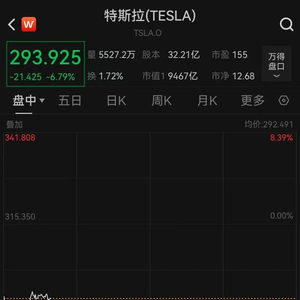7月7日周一,特斯拉(TSLA.US)开盘大跌,一度跌超8%。截至22时30分左右,跌幅收窄至6.79%,最新股价报293.925美元。