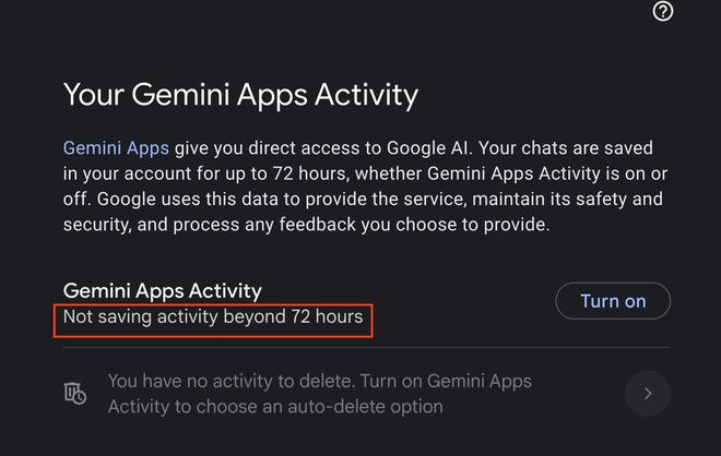 页面仅显示“不会保存 72 小时前的活动记录”,但想要查找记录的时候,需要用户从手机端访问,但在手机端上又没有相关入口和条目,用户不清楚是否已完全禁用 Gemini 了。