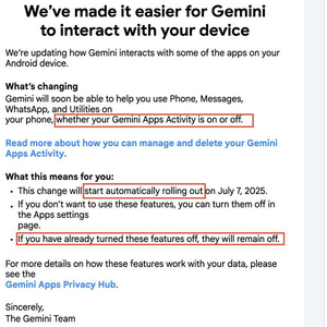 邮件中提到变化将“今天自动开始逐步推出”,无论用户是否开启或者关闭 Gemini 应用活动(App Activity),都将给予 Gemini 权限,访问 WhatsApp、Messages 和 Phone 等应用。