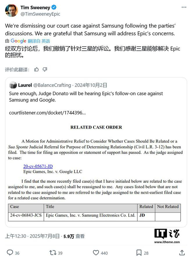 IT之家 7 月 8 日消息,在 7 月 9 日 Galaxy Unpacked 发布会召开之前,三星松了一口气,在美国解决了和 Epic Games 之间相关诉讼。