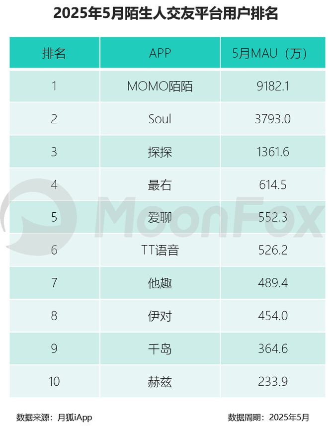 根据极光月狐最新数据,陌陌和soul占据市场前二,其中陌陌领先差距明显。