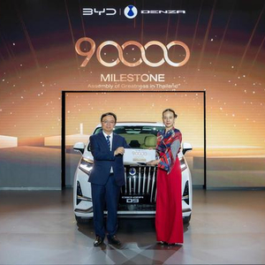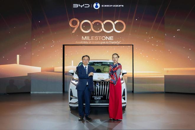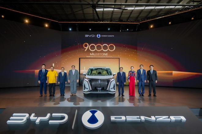 比亚迪股份有限公司董事长兼总裁王传福亲临现场,向泰国第 90000 台比亚迪汽车车主 —— 泰国足协主席伍伦盼交付了一辆腾势 D9。除此之外,比亚迪驱逐舰 05 宣布在泰国工厂下线,即将在当地上市。
