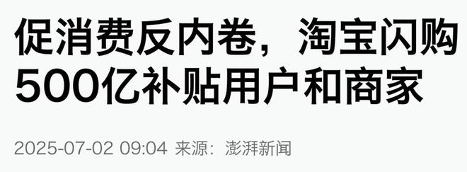 7 月 2 号的时候,淘宝闪购先喊出了 “ 促销费反内卷 ” 的口号,说是今年要用 500 亿补贴用户和商家。