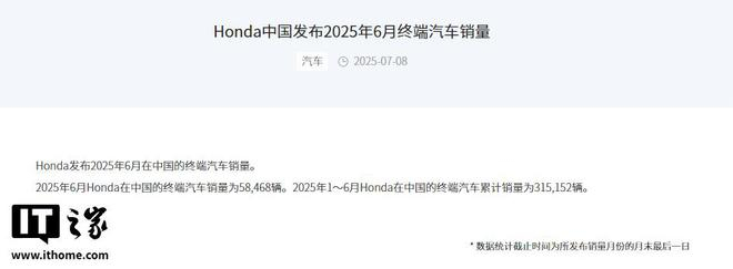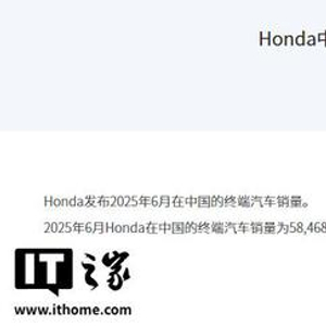 IT之家 7 月 8 日消息,本田中国刚刚公布了最新的 2025 年 6 月终端汽车销量数据 ——58,468 辆。今年 1~6 月本田在中国的终端汽车累计销量为 315,152 辆。