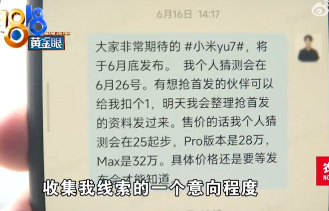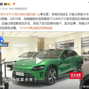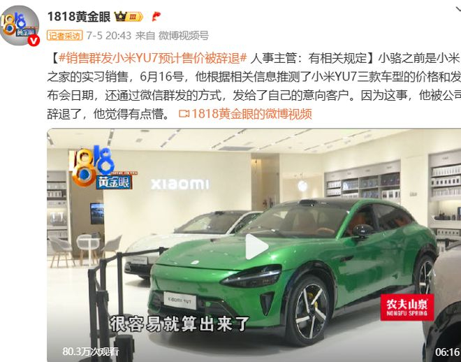 电动知家消息,近日,据浙江电视台6频道《1818黄金眼》报道,小米汽车实习销售小骆(化名)因提前预测小米YU7的价格和发布会日期,并将这些信息通过微信群发给意向客户,随后被公司辞退。