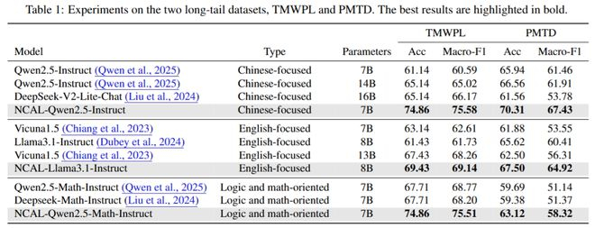实验验证方面,在两个具有代表性的长尾教育数据集上,NCAL展现出了显著且一致的性能提升。7B参数的NCAL模型超越了14B规模的基线模型,证明了方法的参数效率优势。
