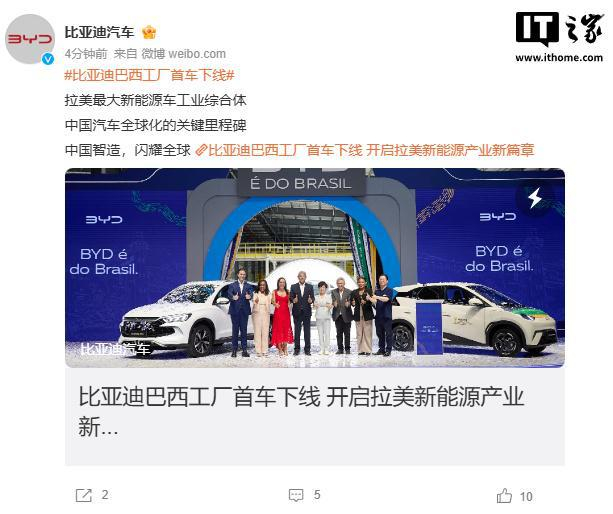 当地时间 7 月 1 日,比亚迪在巴西巴伊亚州卡马萨里举行巴西乘用车工厂首车下线仪式,标志着比亚迪全球化战略迈入新阶段。