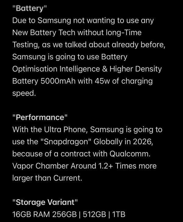IT之家 7 月 8 日消息,消息源 @PandaFlashPro 于 7 月 5 日在 X 平台发布系列推文,分享了三星 Galaxy S26 Ultra 手机的核心规格参数,预计电池容量仍为 5000mAh,支持最高 45W 充电。