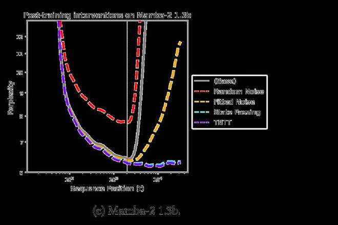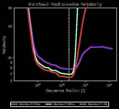 事实也确实如此,举例来说,下图为 Mamba-2 检查点在不同序列位置上的性能变化(以困惑度 Perplexity 衡量,数值越低代表性能越好)。可以明显看到,一旦序列位置超出了训练上下文范围,这些模型几乎就变得毫无作用:它们无法实现长度泛化。