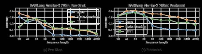 从下图可以观察到,状态传递(State Passing)在少样本和微调设置下都增强了模型的长度泛化能力(模型是在长度为 2048 的序列上进行训练和微调的)。