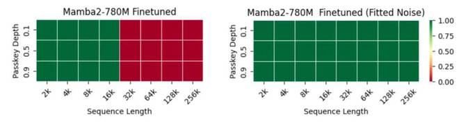 下图展示了 Mamba-2 370M 和 780M 官方检查点在三种设置下的表现:零样本、常规微调和使用拟合噪声进行微调。经过拟合噪声微调的模型能够利用超过 2048 个位置(训练上下文长度)之间的 token 关系。特别地,780M 模型能够完美地解决长度为 256k 的序列中的密码检索任务。