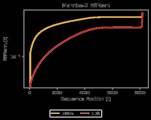 经过状态传递的后训练,EffRem 曲线显示出逐渐上升,表明模型对远程 token 的权重最小,并逐渐增加对最近 token 的权重。特别是,紧邻上下文中的 token(例如句子中的前一个词)对下一 token 的预测具有重要影响,这正是文本建模中期望的行为。