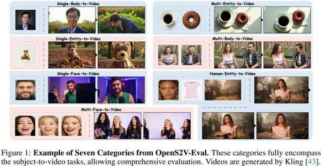 为应对这一挑战,团队提出了 OpenS2V-Eval,这是领域内首个全面的 Subject-to-Video(S2V)评测基准。具体而言,团队定义了七大类别(见图示):① 单人脸生成视频,② 单人全身生成视频,③ 单实体生成视频,④ 多人脸生成视频,⑤ 多人全身生成视频,⑥ 多实体生成视频,⑦ 人物与实体混合生成视频。针对每个类别,设计了 30 个富含视觉内容的测试样本,用于全面评测模型在不同主体上的泛化能力。