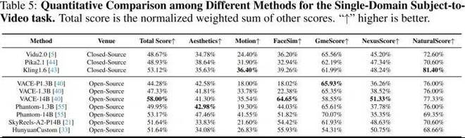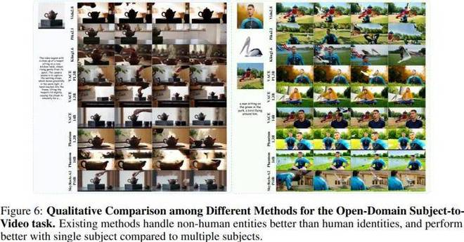 团队评估了几乎所有的 S2V 模型,包括四个闭源模型和十二个开源模型。这些模型涵盖了支持所有类型主体的模型,以及仅支持人物身份的模型。结果如下图所示,总体而言,闭源模型在整体能力方面表现出明显优势(例如 Kling)。以 Phantom 和 VACE 为代表的开源模型正在逐步缩小这一差距;然而,这两种模型都存在以下三个共同问题:(1)泛化能力差:某些主体的保真度较低。例如,在下图 6 的案例 2 中,Kling 生成了错误的操场背景,而 VACE、Phantom 和 SkyReels-A2 生成了保真度较低的人物和鸟类;(2)复制粘贴问题:在图 7 中,SkyReels-A2 和 VACE 错误地将参考图像中的表情、光照或姿态复制到生成视频中,导致输出不自然;(3)人类保真度不足:图 7 显示所有模型都未能准确渲染人物侧脸。此外,还观察到:(1)随着参考图像数量的增加,保真度逐渐下降;(2)初始帧可能模糊或直接被复制;(3)保真度随时间逐渐下降。