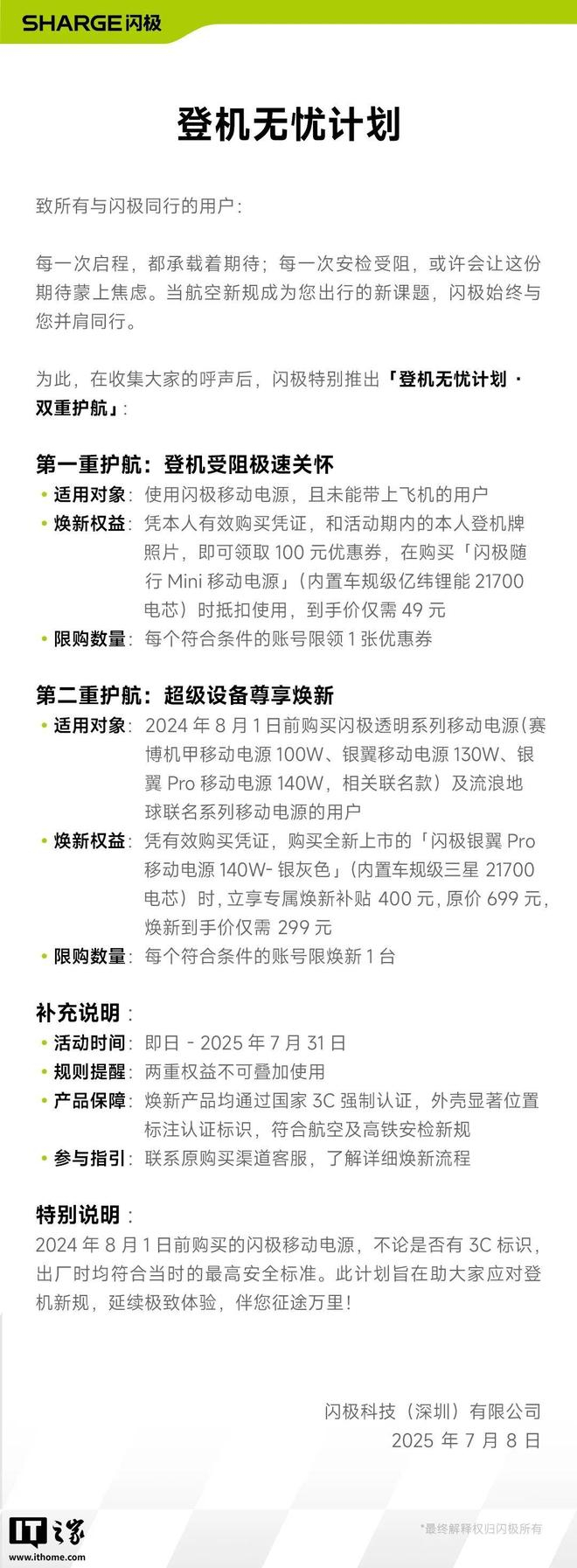 IT之家 7 月 8 日消息,充电宝品牌闪极今日发布“登机无忧计划”,针对两类用户提供专属福利。
