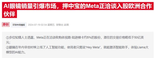 财联社一年前的报道提到,当时就有消息称,Meta正探索向依视路陆逊梯卡进行数十亿欧元的投资,可能收购后者约5%的股份。