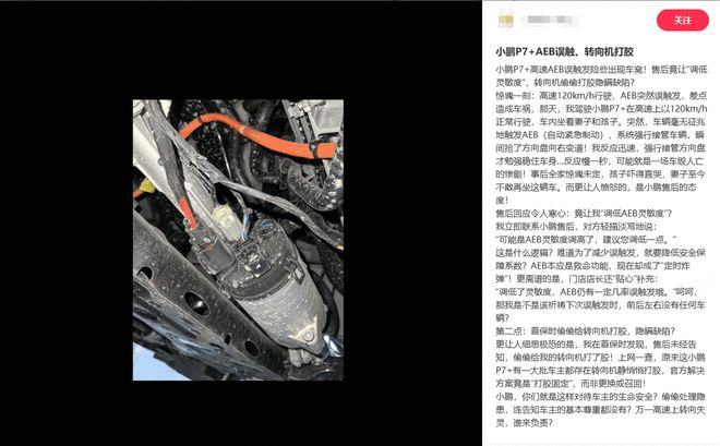 其中一位车主表示:自己在高速路上以120km/h正常行驶,AEB突然误触发,差点造成车祸。售后回应让车主调低AEB灵敏度。他还表示,自己在首保时发现,售后未经告知,偷偷为其车转向机打胶。