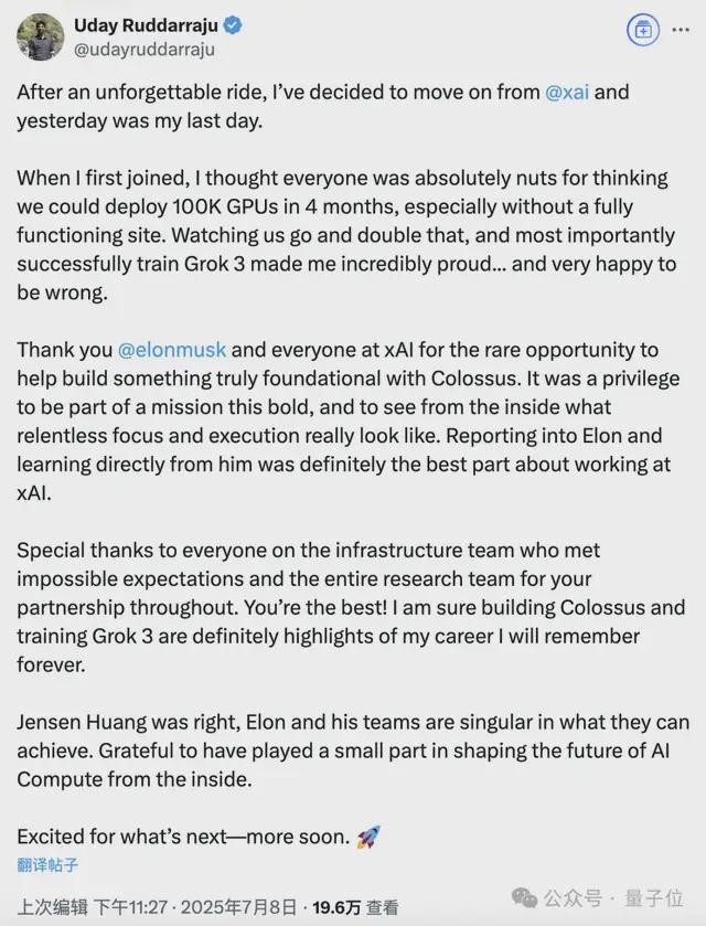 起初他们都认为这是一件疯狂的事,但最后团队成功完成了这项工作,让Uday对在xAI的工作感到非常自豪。