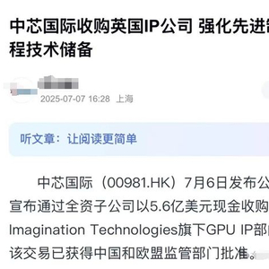 近期,有自媒体发布消息称,“中芯国际7月6日发布公告,宣布通过全资子公司收购英国Imagination Technologies GPU IP部门,该交易已获得中国和欧盟监管部门的批准”。