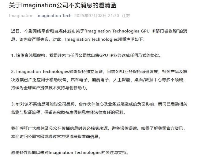 Imagination Technologies还呼吁,“广大媒体及公众在传播信息时务必核实来源,避免误传误读。”