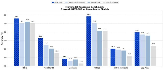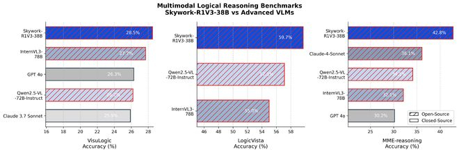从基准测试结果来看,Skywork-R1V 3.0的表现也毫不逊色,已经在多个维度超过同类开源模型和主流闭源模型