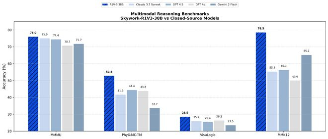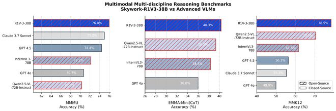 大规模多学科多模态理解和推理基准测试MMMU中,Skywork-R1V 3.0的基准测试成绩为76.0分,人类专家平均分数为76.2分,其表现超过Claude-3.7-Sonnet 和GPT-4.5等闭源模型。