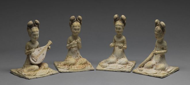 题目:请仔细观察下方图上的音乐家俑,并结合历史背景和视觉细节,使用中文回答以下问题: