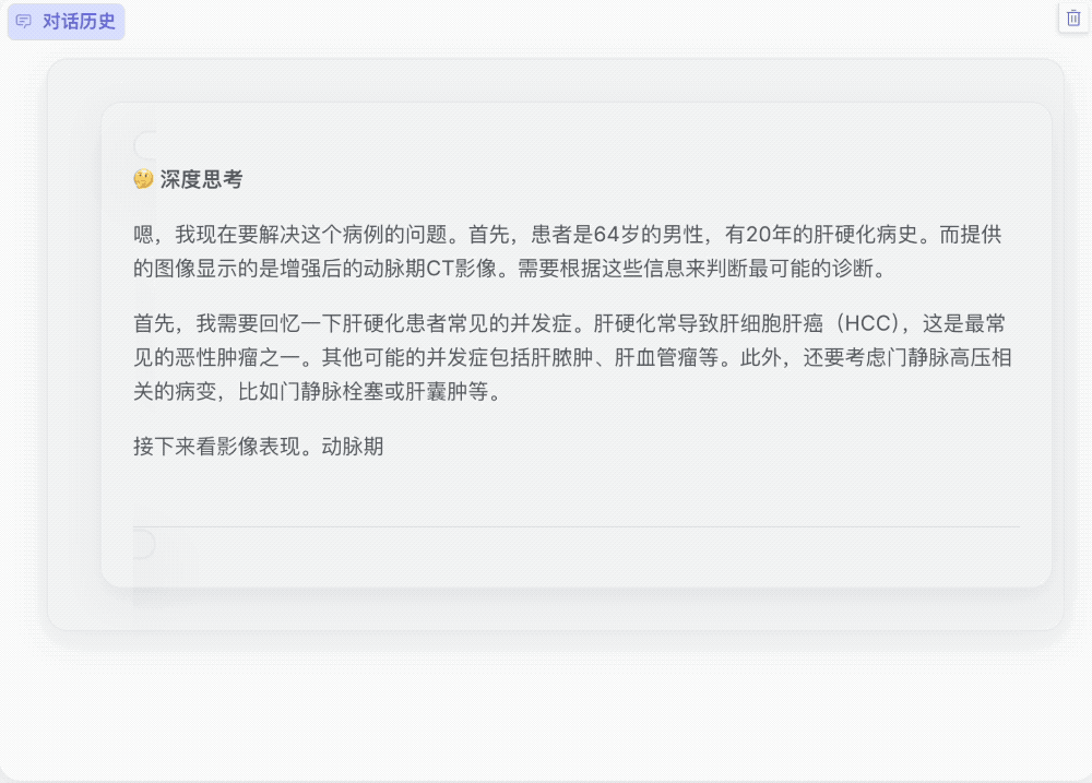 Skywork-R1V 3.0综合分析了20年肝硬化病史64岁男性患者的病史、动脉影像特点以及肝细胞癌的表现,在列出可能鉴别诊断的情况下,还针对影像特征进行了具体解释。
