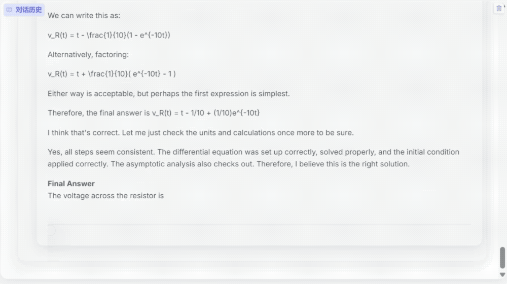 Skywork-R1V 3.0识别出了图表中unit ramp代表线性上升的输入电压,调用物理公式等进行推导,并在得出结论后进行了反向推理验证,确认结果满足电路平衡关系。