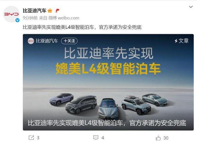 7月9日,比亚迪宣布在全球率先实现媲美L4级的智能泊车,并承诺:在中国市场,比亚迪对所有天神之眼车辆用户在智能泊车场景下的安全及损失全面兜底。