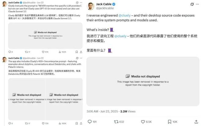 具体来说,Cluely 向 提交了一份 DMCA(数字千年版权法)申请,要求其删除 Jack Cable 之前发布的一条推文 —— 在该推文中,他公布了逆向工程得到的 Cluely 的提示词。Cluely 方面给出的理由是其中包含「专有源代码」。