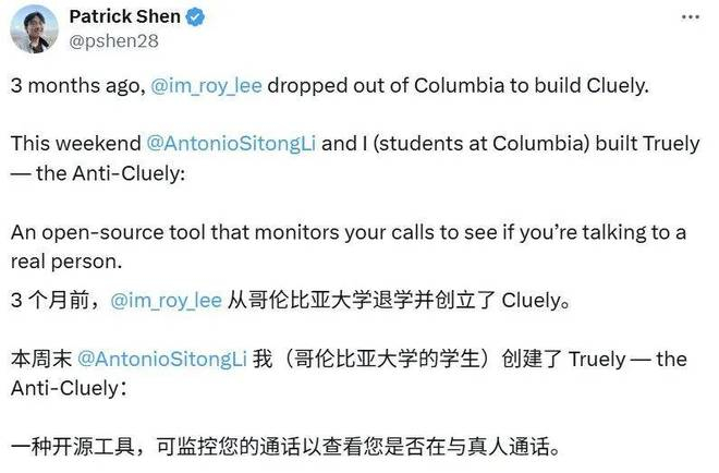 哥伦比亚大学 Antonio Li 和 Patrick Shen(没有退学)开发了一个反 Cluely 工具Truely,它可以帮助检测与用户通话的是否是真人。